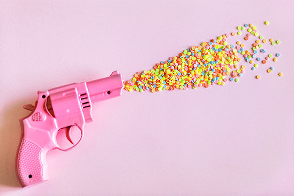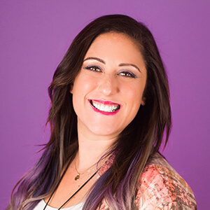 Flat cartoony illustrations with vivid unblended colors and asymmetrical beautiful purple hair lady